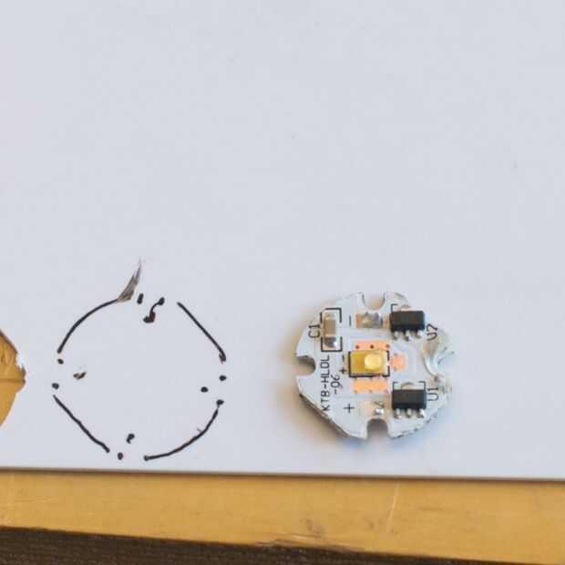 En el centro de la plataforma, el led se montará. Para asegurarse de que el led está montado como cerca a la plataforma como sea posible, perforé 4 orificios pequeños (1,5 mm de ancho), correspondientes a cuatro los LEDs plomos. Para obtener el derecho de punto de los agujeros: montar el led en el reflector y coloque sobre la plataforma. Introduzca el led en la plataforma de plástico. Los cables dejan hoyos pequeños en el plástico.