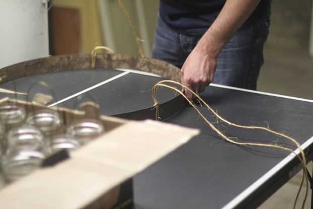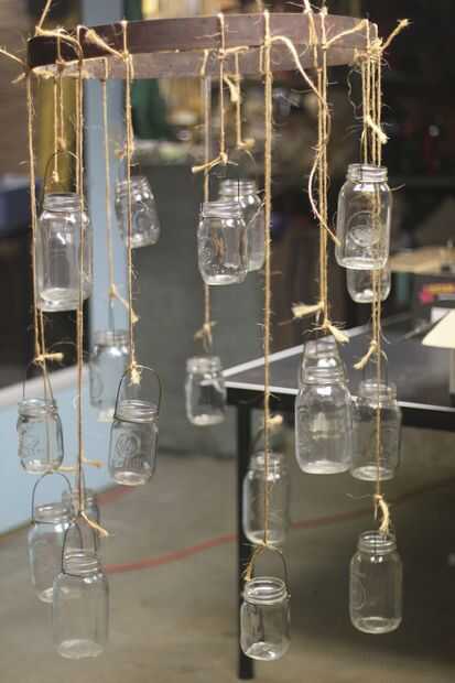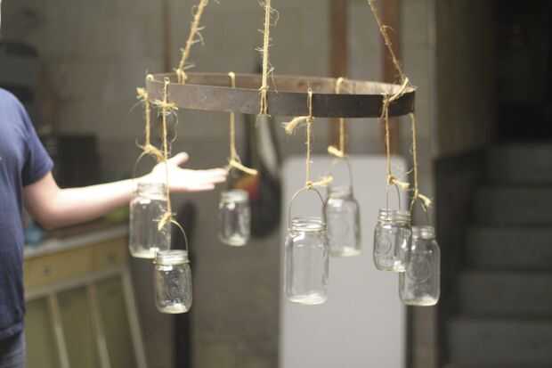 Colgar los frascos es un proceso simple pero tedioso que requiere muy pocos nudos. Usé nudos simples por todo lo alto y que los extremos se truncó para no prenderse fuego.
