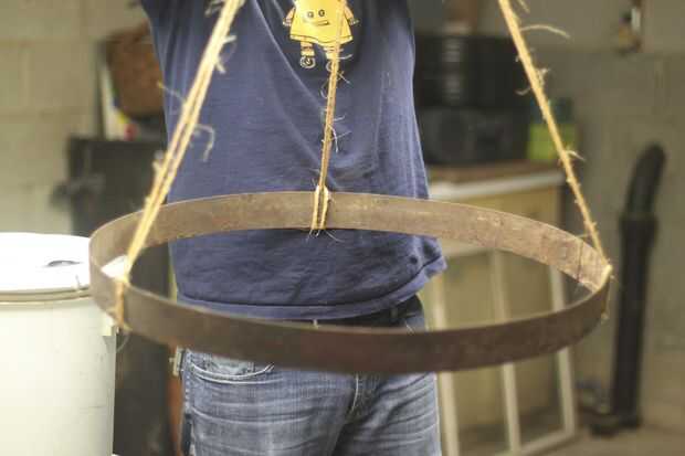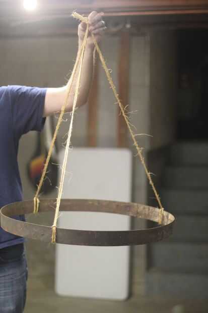 •Begin por colgar su rueda de carro o barril de aro de cuerda fuerte atada a por lo menos tres puntos espaciados uniformemente y colgarse de algo robusto