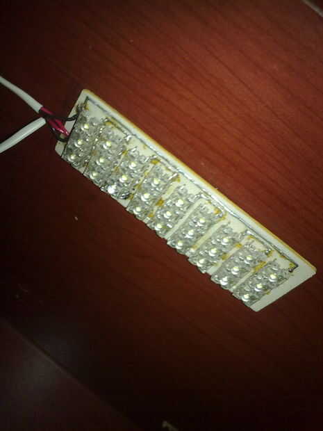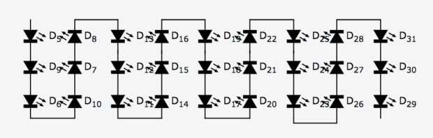 Hay cuatro arreglos de discos conectados en paralelo, cada uno con 27 LEDs de BT30WCS conectados en serie. Cada LED tiene una caída de tensión de 3.2v aproximadamente por lo tanto la matriz de LED todo utiliza 27 x 3, 2V = 87v con una corriente directa de 30mA.