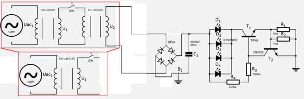 Necesitamos sobre 60VAC hacer que este circuito funcione. Un transformador personalizado puede ser o, si tienes suerte, tal vez encuentras uno con esta calificación. Este circuito utiliza dos transformadores, primero un 120 a 5v transformador de (proporción 24:1) seguido de un 120 para 9v (ratio 13.3:1) invertido para obtener un total de 120 a 66v (ratio 1.8:1).