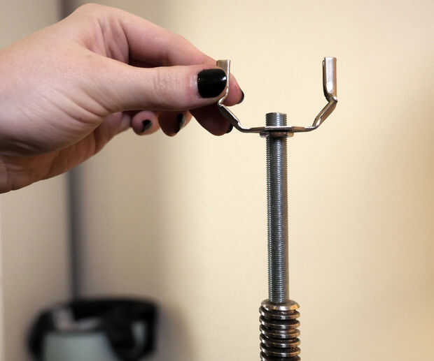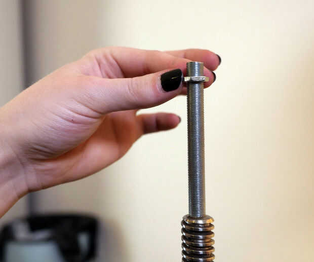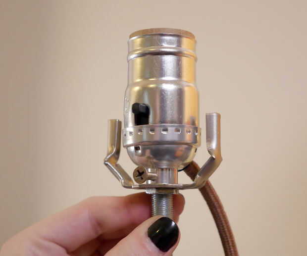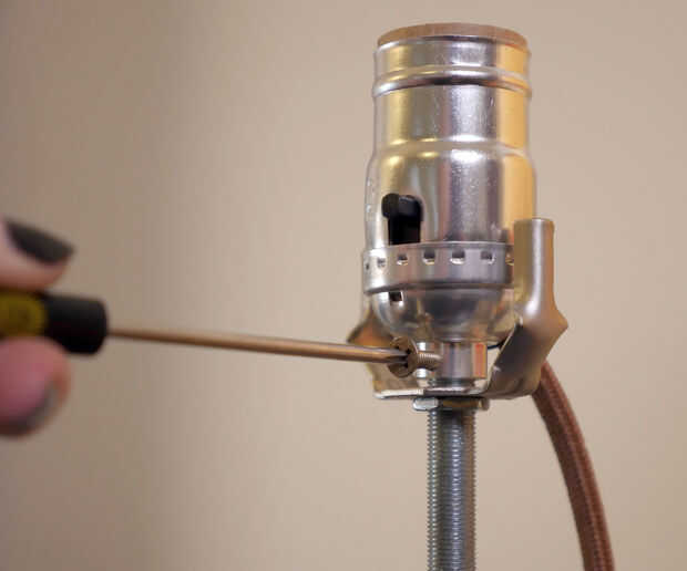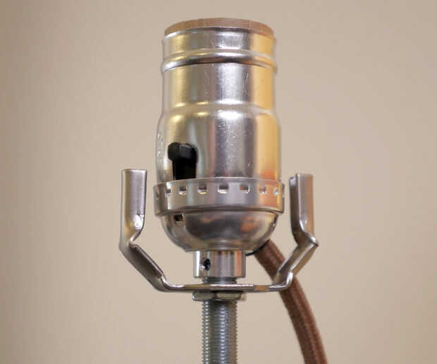 Enrosque una tuerca en la varilla roscada de la lámpara, luego agregar la base de arpa. A continuación, atornille el ensamble de base de alambre y apriete su tornillo de fijación. Ajustar la tuerca apriete el arpa con la base de la toma e instalar un bulbo y la parte superior de la arpa. Añadir la sombra y asegure con un finial.