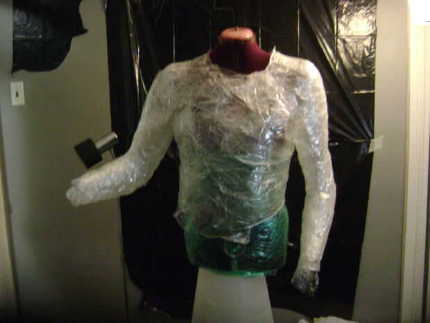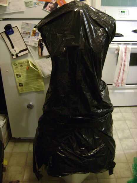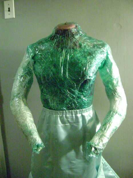 A continuación usted necesitará preparar el maniquí. Ajuste la forma del vestido para que la ropa se ajusta muy bien. Cubrir el formulario con envoltura de plástico o bolsas de plástico para protegerlo de conseguir pegado a la ropa. No utilice bolsas con logotipos en ellos como la escritura o imágenes pueden transferir a la ropa.