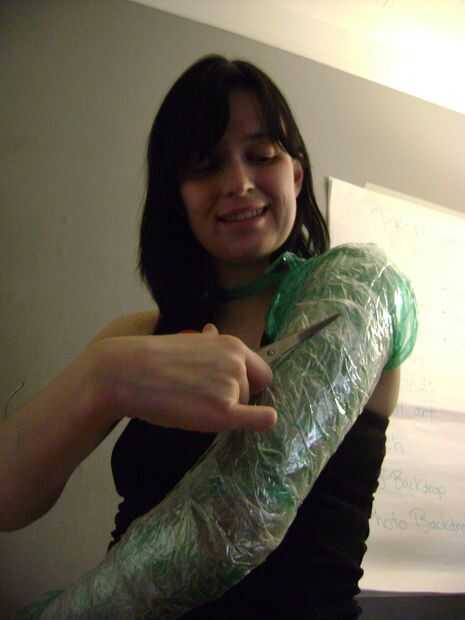 Si tu vestido tiene mangas su formulario tendrá brazos. Usted puede hacer los brazos del mismo modo que usted puede hacer una forma de cinta. He utilizado cinta adhesiva en el pasado, pero para este proyecto hice copias de mis brazos y torso entero de mi novio de cinta de embalaje. Primero envolver tu brazo (o torso) en envoltura de plástico y luego envuelva completamente en cinta. Cuando termine, cortar el molde, cinta detrás juntos y luego lo rellene con periódico.