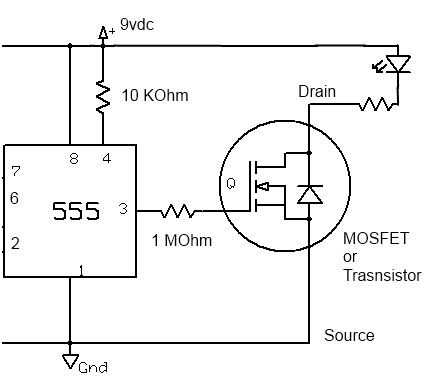 No tengo un transistor de potencia pero tengo un montón de irf610 MOSFETs. Por qué es un transistor o MOSFET necesitada. Bueno, el 555 IC sólo puede manejar máximo 200 miliamperios. Diez LED en 20 miliamperios es empujar ese límite. La solución es enviar la señal de salida que sale del PIN 3 en una resistencia de 1 m Ohm y conectar la resistencia a la puerta de un MOSFET. Ahora la actual pasando por el pin de salida del 555 es probablemente menor que la energía de luz 1 LED. El MOSFET puede manejar 1,5 amperios por lo que 200 miliamperios es nada.