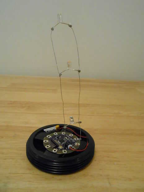 Caliente pegué mi Lilypad y batería en el interior de mi tapa. La tapa que compré fue un casquillo de PVC negro, que así le sucedió a aflojar en la parte superior (Lucky me.) La tapa capaz de desenroscar hecho fácil de cargar.