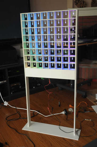 Mi intención es la matriz de madera, y fijarlo a un soporte de madera. Sin embargo, debido a las limitaciones de tiempo, decidí primer prototipo utilizando el tablero de la espuma. Corté dos piezas de 45 x 2" para formar las piernas. Para una mayor estabilidad, la sección inferior es dos capas gruesas. La base es de 22 x 6". La caja directamente debajo de la matriz, que alberga el Colorduino, utiliza dos hojas de 18 x 3" para sus lados.
