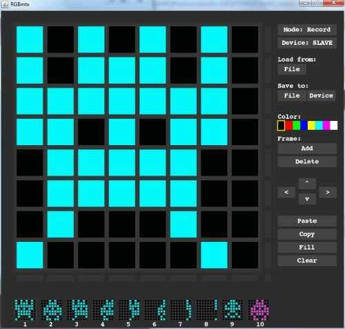Para crear animaciones para su matriz, simplemente use el editor en modo de grabación . Cuando editar fotogramas mientras está conectado el Colorduino, la matriz se actualizará al instante en tiempo real. Haga clic en los parches de color para seleccionar el color de dibujo actual. Para seleccionar un color que no está en la paleta predeterminada, mantenga presionada la tecla CTRL mientras hace clic en un parche de color para tirar de un selector de color del RGB (Nota: por alguna razón que no puedo averiguar, tirando hacia arriba de un selector de color a veces se congela RGBmtx. Por lo tanto, asegúrese de guardar su trabajo en primer lugar). Los pequeños botones a la derecha, parte inferior y parte inferior derecha permiten rellenar una fila entera, columna o la matriz entera con el color seleccionado. Puede utilizar la matriz como una luz de estado de ánimo rellenando con un solo color.