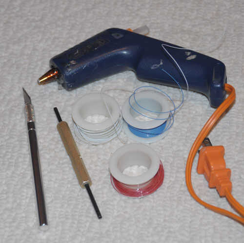 montón de 30AWG kynar aisló alambre de embalaje. Compré 3 rollos de 50 pies en Radio Shack, cada uno de rojo, blanco, azul. 150 pies es excesiva, pero es mucho más fácil trabajar con diferentes colores de hilo.