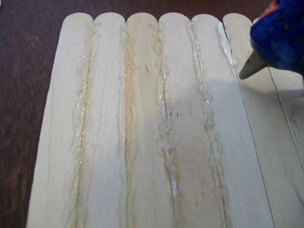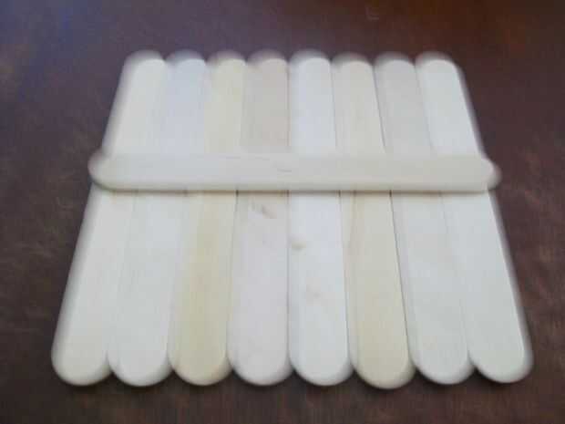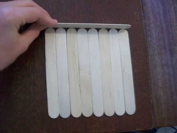 En primer lugar, conseguir ocho palitos de Popsicle. Los ponen al lado, y aseguramos están todos alineados juntos. Empujando otro palito contra ellos, como en la imagen, puede hacerlo. Ahora pega las ocho juntas. A continuación, pega otro palo a través de ellas.