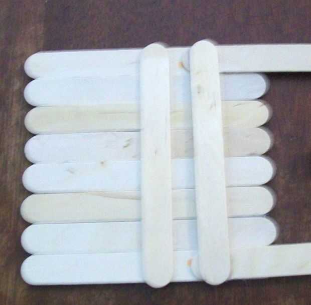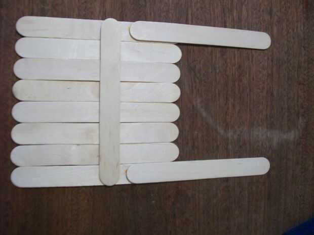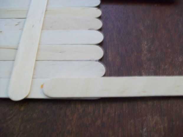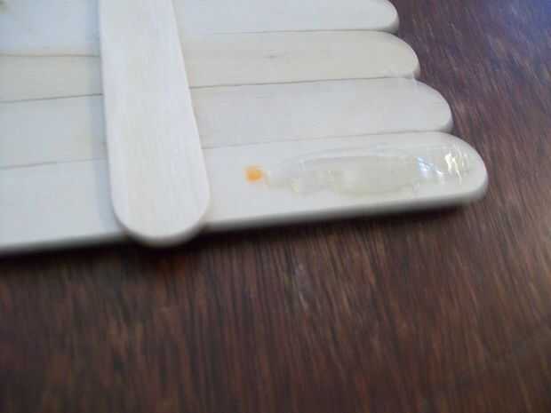 En uno de los lados mide dos pulgadas hacia abajo y haga una marca. Ahora puso pegamento en hasta esa marca y poner un palo en el. Ahora hacer lo mismo en el otro lado para eso él se ve como imagen 4. A continuación, pegue otro palo en la parte inferior de los dos a pegado, como cuadro 5.