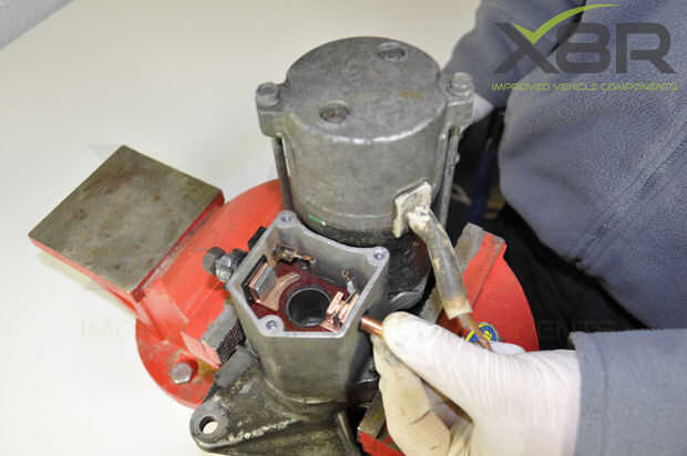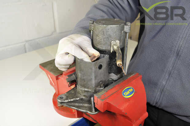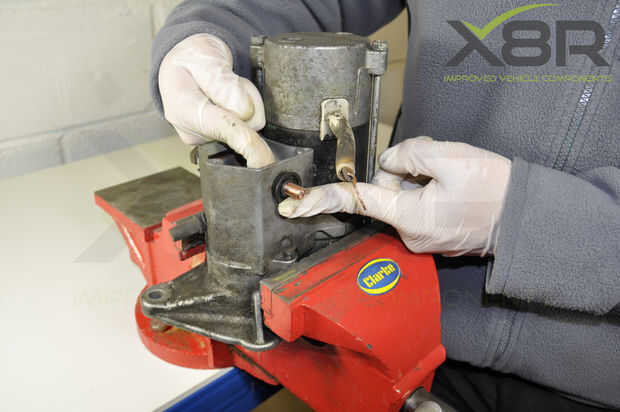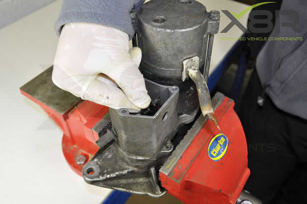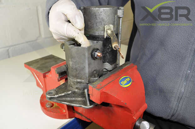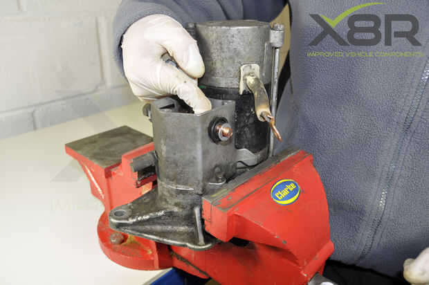 Ahora desde el interior del motor de arranque verás el tornillo de contacto y un cable con un conector, sujete el conector y tratar de empujar el perno hacia fuera. Si no se mueve, haz un pequeño destornillador de cabeza plano. Sosteniendo el conector otra vez, la palanca el tornillo hacia fuera.