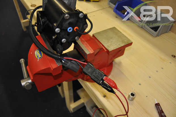 Conectar un 12v alimentación positiva de una batería de coche a la Red de alambre para el compresor y un feed desde el terminal negativo de la batería al negro de alambre para el compresor. Ahora funcionará el compresor, compruebe que la salida es buena, que usted no debería ser capaz de parar el aire es expulsado de la unidad cuando poner el pulgar sobre el tubo de salida, si usted puede detener el flujo hay un problema con instalar, si no salida es buena y puede proceder a instalar.