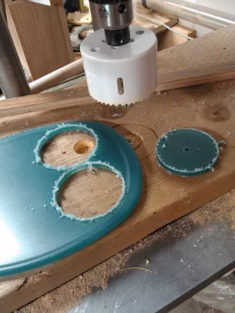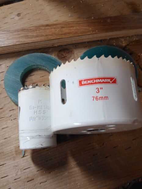 Usé dos sierras. 3" de diámetro exterior y luego un 1 3/8" para encajar el eje interno en el hardware - casi. He tenido que agrandar un poco con una herramienta giratoria.