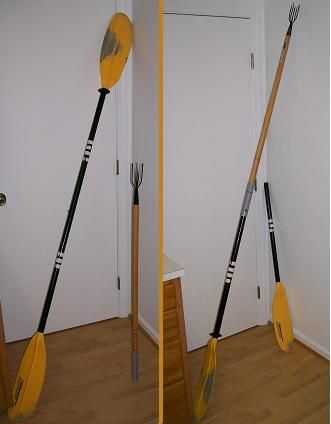 Tengo un kayak de 13 pies y un garaje lleno de gente, y almacenaje horizontal (utilizando un sistema de polea para una bicicleta) era problemático. Por suerte mi garaje lleno de gente tiene un bonito techo alto con vigas a la vista, así que pude aseg