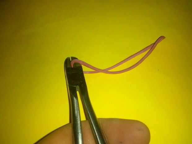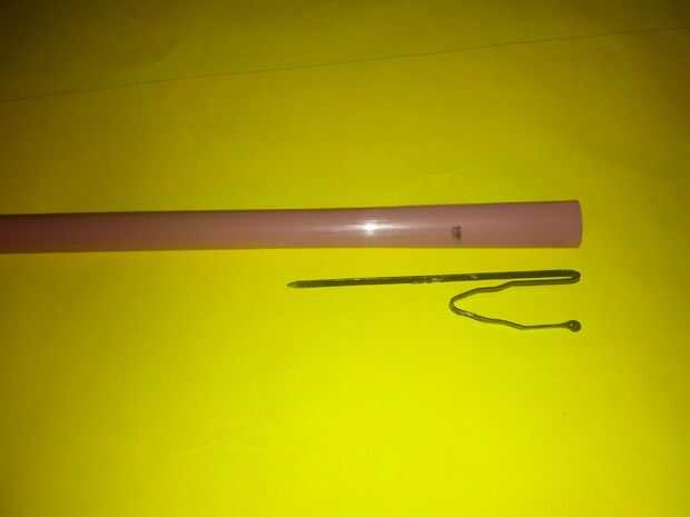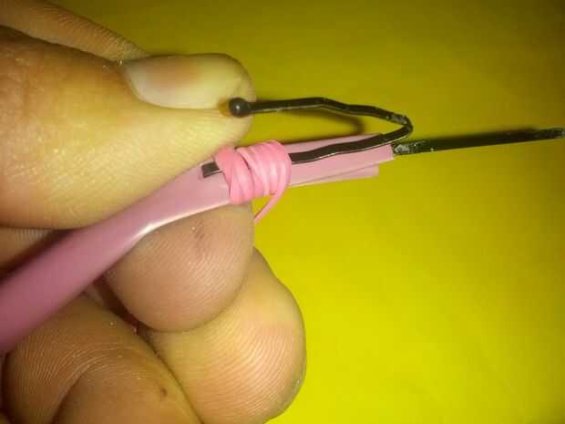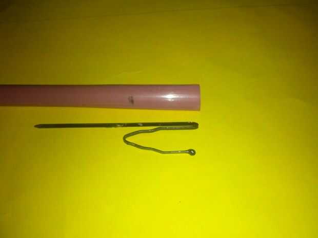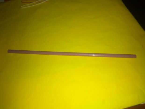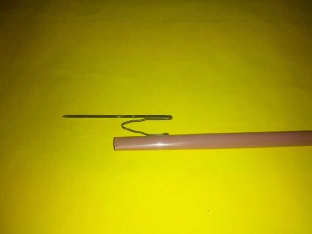 Colocar la paja junto con horquilla, medir la distancia entre la horquilla de la doblez y el extremo de la pajilla, ponga una marca. En la marca Cruz de la horquilla y gire hasta que la punta del punto al final de la paja. Tomamos una cinta de goma y cortar. Garantizar la horquilla la paja usando la banda elástica, dejar un pequeño Consejo para atar después Giramos alrededor de la paja, con la tensión más alta se puede.