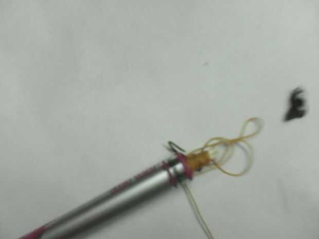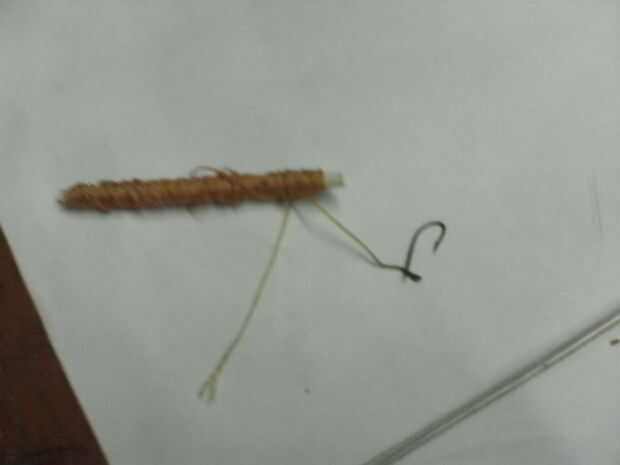 take 4 feet fishing cord. Un gancho de pesca y flotante. Fije el gancho de la pesca y el flotador. Tuerza el cable alrededor del flotador y colóquelo en un tubo de vacío de la pluma y cerrar. Introducir la pluma en el otro lado del tubo y sellar con masilla de agua