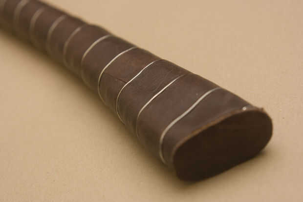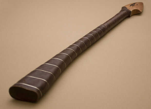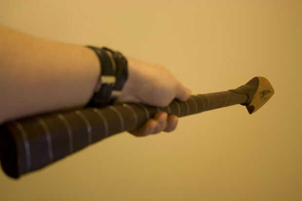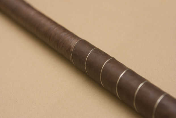 El tubo entonces fue cubierto en hoja de caucho de neumático, con una pequeña escultura con restos de madera en el extremo de la manija.