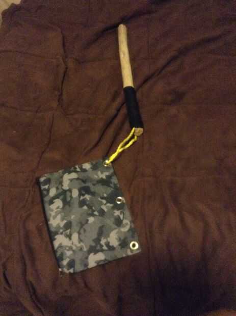 Conseguir la cinta de agarre y Envuélvala alrededor de la parte inferior del palillo/pasador y luego coloque la cuerda por un agujero de la bolsa de lápiz y cinta adhesiva en el palo
