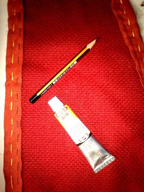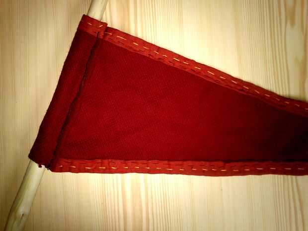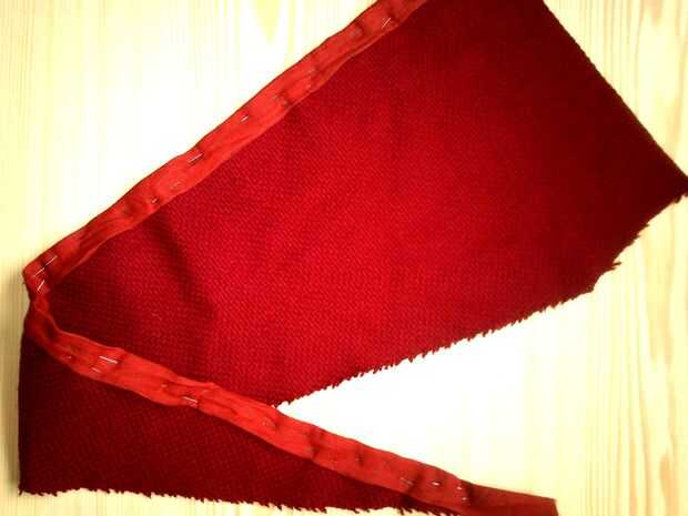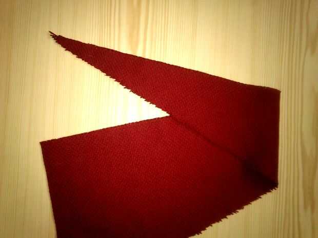 Para elegir a telas (Recuerde, que materiales naturales lucen mejor ;)) y corte la forma deseada. Elegí el triángulo derecho-anguloso. Entonces se necesita algo para la cinta. Elegí la lana y el paño de lino, porque tenía algunos restos en la casa.