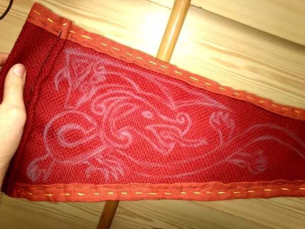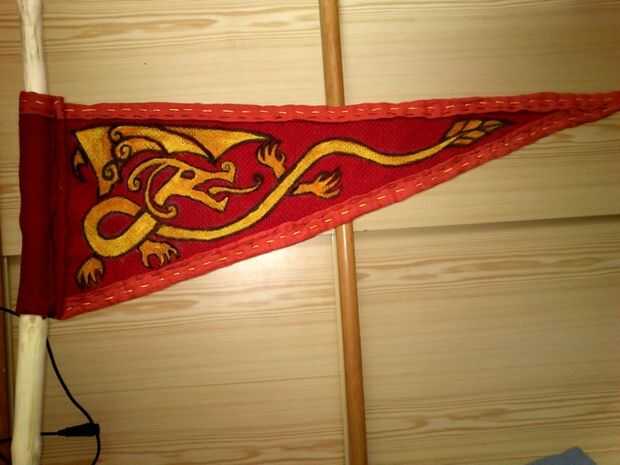 También puede agregar alguna decoración. Por ejemplo algunas pieles, cuero, plumas, runas, etc... Me decidí por una bandera! :)