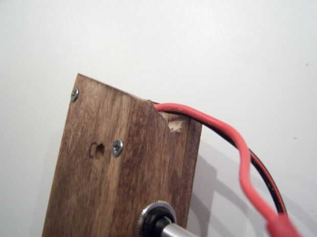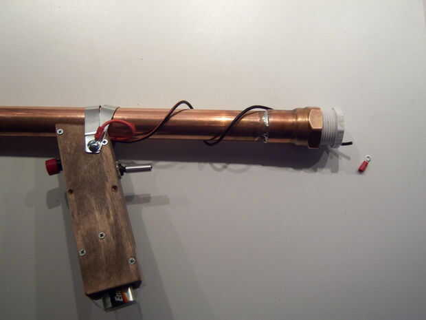 Con el mango de montaje Corte una pequeña muesca en el arco por encima del interruptor de seguridad con su dremel.  Tender los cables en esta ranura y luego fije la manija al cañón con su 1" abrazaderas y pernos. Deslice el anillo positivo terminal sobre el perno. Envuelva el cable negativo en la barra unas cuantas veces y corte a la longitud deseada. Fije el anillo más pequeño terminal en el cable negativo.