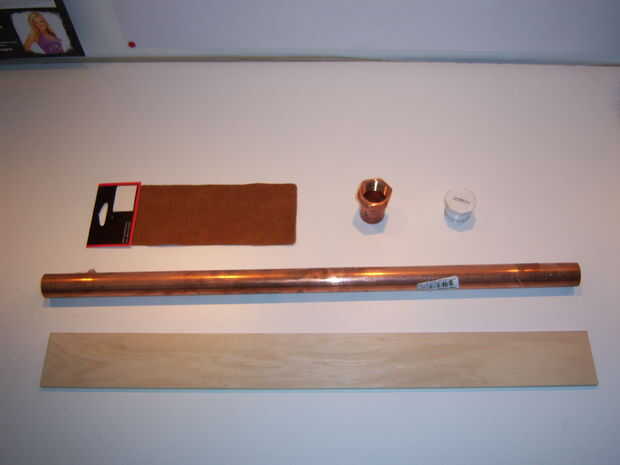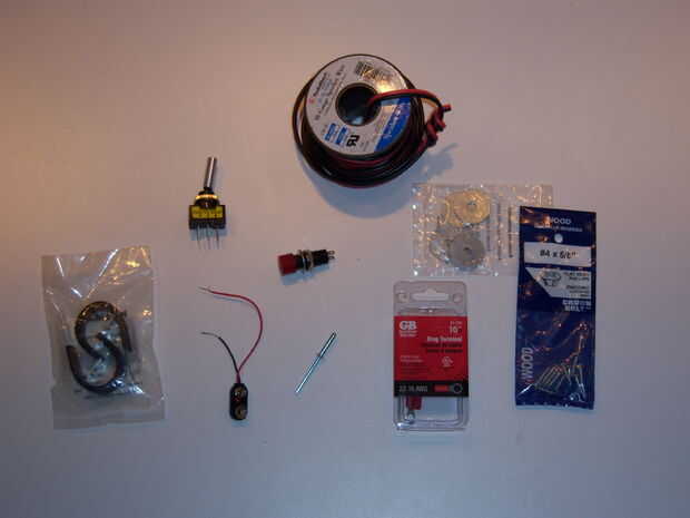 1" rosca pvc tapa pedazo de cuero (opcional) madera de 2 1/2" x 24" x 1/4" madera tornillos #4 x 5/8 "#12 x 2" perno de la máquina w / tuerca (no mostrado) 18 calibre cable de altavoz (también utilicé otros cables más pequeños también) aisló el terminal de anillo (2 tamaños) 2) arandelas de defensa 1/8 "X 3/4" contacto momentáneo interruptor de botón pulsador iluminado 9 voltios clip 1" aislado abrazaderas de acero del remache 1/8" diámetro x 1/2 grip