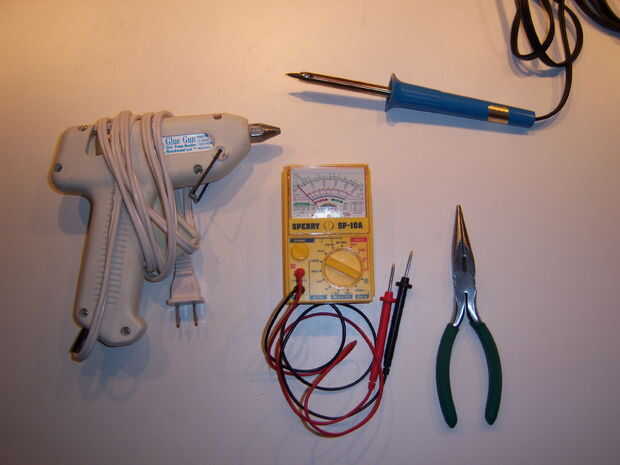 Taladro rompecabezas diversos pedacitos de taladro (incluyendo 1/2" y 1") (no mostrados) destornillador Dremel (obligatorio para virtualmente cualquier proyecto!) Alicates de punta Wire Strippers antorcha remache herramienta (¿Qué es el nombre propio para esto?) Soldador (opcional pero recomendada) óhmetro (opcional pero recomendado) caliente pistola de pegamento (opcional pero recomendado)