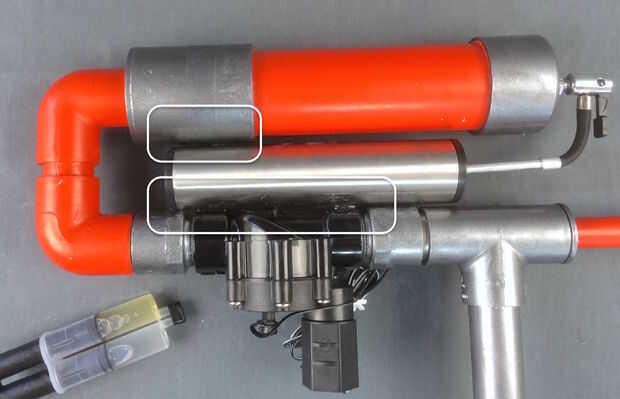 - Mezcla aproximadamente 1 / 4oz de epoxy. Pone el lanzador del cohete en su lado. Scoop hasta el epoxy con una cuchara de plástico y vierta cuidadosamente entre el compresor y la válvula del aspersor, y entre el acoplador de 2".