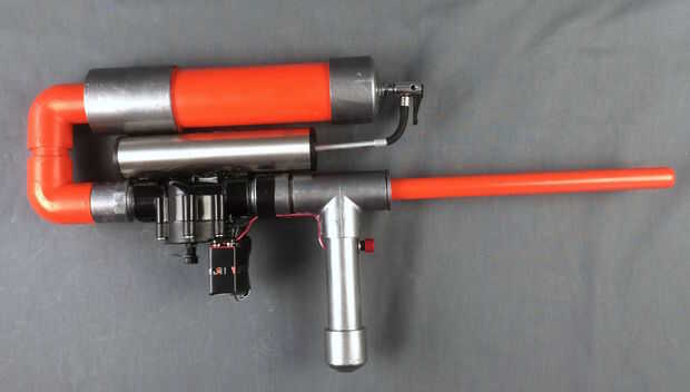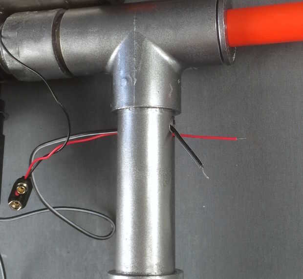 - Inserte un cable del solenoide y un alambre de clip de batería de 9V a través del orificio de 1/8" en el mango y el agujero más grande.