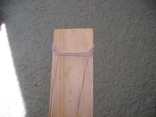 tomar tres más elásticos y enganche los elásticos en la parte superior por encima del elástico en la ranura y darles de comer bajo el elástico primera ya en la pieza de madera. Si usted está teniendo problemas, intente alimentar el elástico debajo del elástico y luego enganche sobre el lanzador.