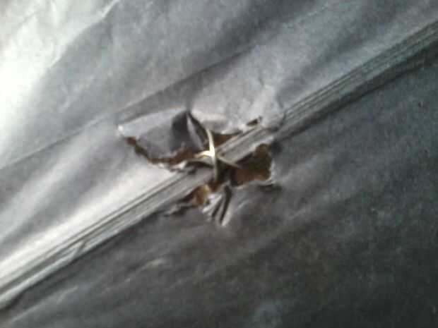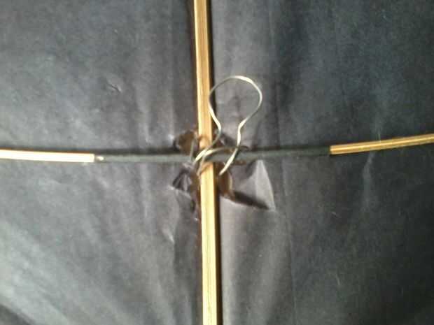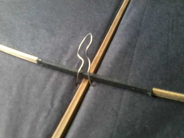 En primer lugar, inserte el gancho en la cometa, en la parte superior (lado con los marcos visibles) de la intersección de marco, con una pierna en la izquierda y otro a la derecha del palo vertical (como se muestra).
