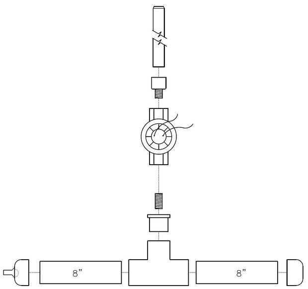 Lo primero que quieres hacer es taladrar un agujero en uno de los tapones de 2" para el vástago de la válvula tubeless. debe haber un tamaño de agujero indicado en el envase. O si no, de cualquier manera tienes que empezar con una pequeña broca y gradualmente subir de tamaño para asegurarse de que usted corte un orificio limpio. PVC suave y tiende a rasgarse si tratas de hacer demasiado en una sola vez. Sacar el vástago de la válvula a través de, debe tomar un poco de fuerza. Puede necesitar alicates pero tenga cuidado de no dañar el vástago de la válvula. Cortar unos 8" longitudes de la 2" PVC, corte 1/2" a unos 3'. Uno de los extremos de 1/2" PVC del chaflán, esto hace más fácil conseguir los cohetes en el extremo del tubo. Pegar todo junto por el diagrama. Ser liberal en el uso de la cartilla y el pegamento. 2" schedule 40 PVC es clasificado para hasta 280 PSI (no que debe o va ser empujándola tan difícil con una bomba de bicicleta) pero los empalmes y conexiones donde la cámara es más probable que falle.
