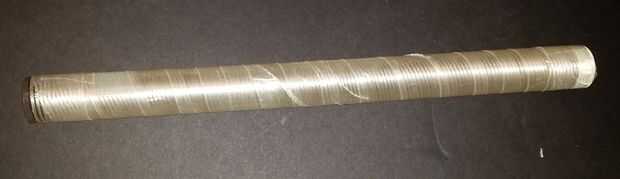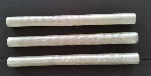 Se hacen los cohetes reforzados con fibras de cinta de embalaje. Esta cinta es el único que soy consciente de que es lo suficientemente fuerte para resistir a las presiones de aire implicadas. Tome un pedazo de papel (1/2 hoja 8 1/2 "x 11") para actuar como espaciador, Enrolle firmemente alrededor de su izquierda sobre la pieza de 1/2" PVC y cinta adhesiva en su lugar con cinta scotch. Este primer trozo de papel actúa como un espaciador para asegurarse de que el tubo del cohete no es demasiado apretado para el PVC después de que envuelva la cinta. Cortar una lámina de 1/2 (aprox. 4 1/4 de "x 11" no necesita ser más exactos) transparencia enróllelo alrededor del papel y sujetarlo con unos trozos de cinta scotch. Utilice la cinta de embalaje y espiral envolver el rollo de acetato, superposición de 1/2 a 1/3 de la anchura. Es difícil mantener las arrugas como el el ángulo de la envoltura inicial parece a arrastrarse a cero como vas subiendo, esto no es crítica, suavizar estas lo mejor pueda. Usé cinta de 1 1/2", 2 1/2" podría funcionar mejor. Por cierto la foto de arriba del proceso de envoltura no muestra al espaciador de papel por debajo. Había olvidado este paso cuando tomé la foto. Recorte el exceso y envuelva un anillo alrededor de ambos extremos. Hice tres tubos de tres cohetes.
