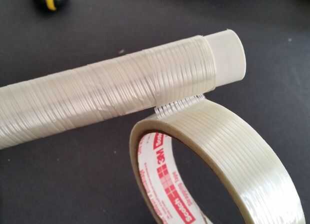 Nota: papel podría ser utilizado en lugar de las hojas de transparencia, es la cinta de embalaje y no las hojas plásticas que dan el cohete su fuerza. Sin embargo las hojas de plástico tienden a mantener Unidas un poco ya cuando repetidamente colocando el cohete sobre el extremo del tubo. También el papel tiende a absorber humedad del aire comprimido y la hierba húmeda ocasional cuando aterriza y existe menos fricción entre la lámina de plástico y PVC que hay con la variedad de papel.