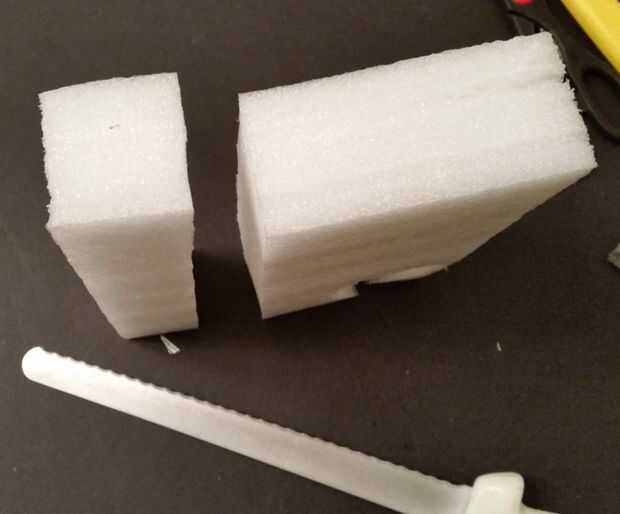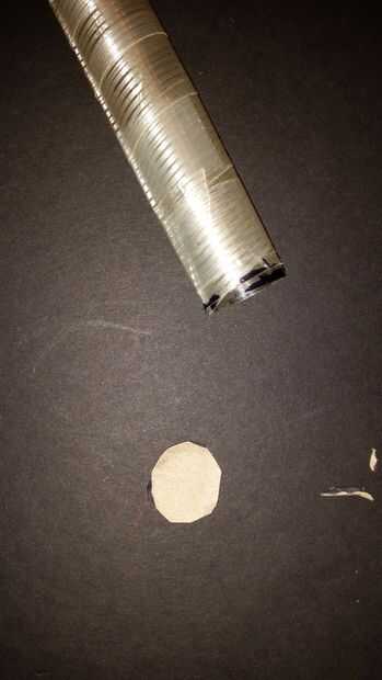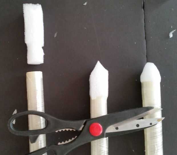 Cortar un cono de espuma de embalaje, forma un it para caber al final con un cuchillo. El material de embalaje actuará como amortiguador de choque como tierras para que pueda reutilizarlo muchas veces o por lo menos hasta que aterriza en un techo de vecinos. Corte para que quepa cómodamente en el final. Encontré que era más fácil de dar forma a la nariz del cohete con un par de tijeras. Cortar un enchufe nuestros de cartón aproximadamente el diámetro exterior de 1/2" PVC. Poner el tubo en 1/2" PVC y el tapón de dentro. Dependiendo de hasta qué punto su cono de nariz va en el tubo, esta parada debe ser 1 1/2" más o menos desde el final.