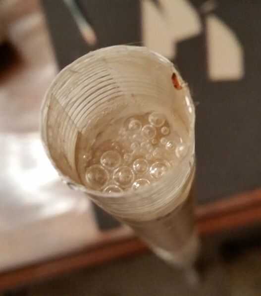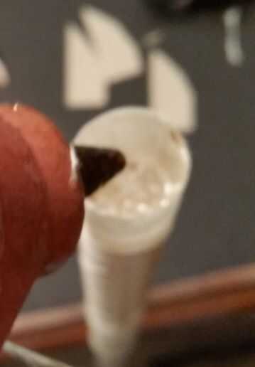 Verter en un poco de pegamento, 1/4 a 3/8" de él. Esto no sólo mantiene su cono de nariz en su lugar pero se convierte en peso de lastre para la parte superior de su cohete muy ligero. Presione el cono de nariz en forzar un poco de pegamento entre el tubo y los laterales. ¡Ten cuidado!. Este es el paso donde he caliente pegué mis dedos y las manos varias veces.