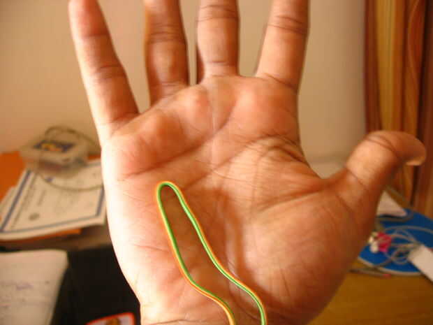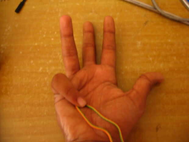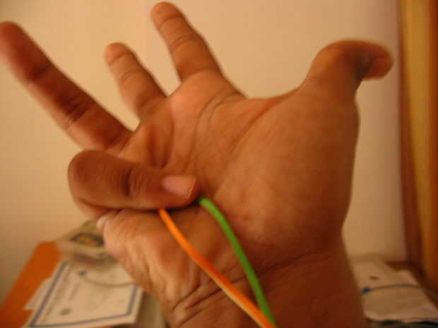 1) cerca de su dedo meñique en su palma. (Deje que los otros tres dedos sobresalen como se muestra en la primera foto).