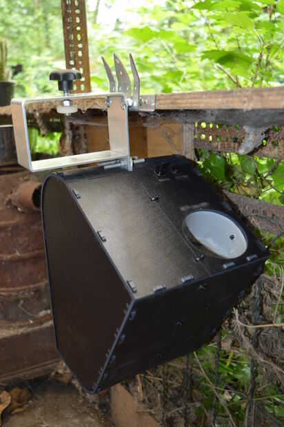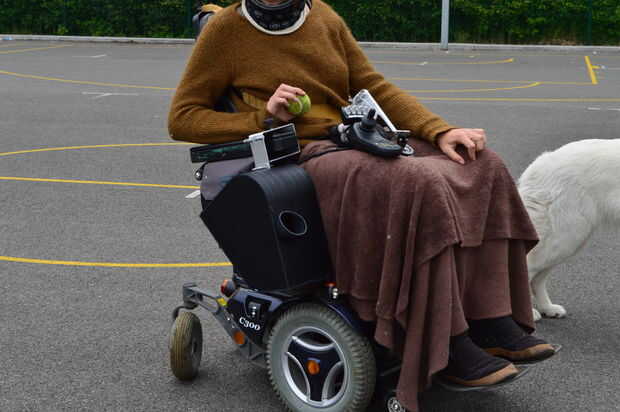 Este tennisball lanzador está diseñado para una mujer en silla de ruedas que no puede tennisballs para jugar y recompensar a su perro.