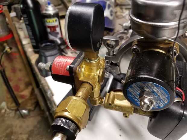 • Tornillo más grande 3/4" solenoide eléctrico en el extremo hembra de bronce TEE que se enfrenta a 90 grados hacia arriba. Instale el silenciador a la abertura roscada hembra del solenoide. Taladré agujeros más grandes en el silenciador cuando descubrí que los agujeros más pequeños limita el aire de salir lo suficientemente rápido para mover la válvula de pistón. Usted puede tener resultados similares.