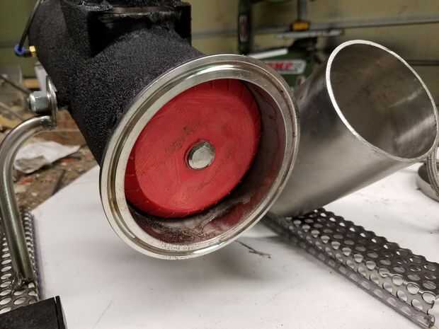 • Fig 1 & 2 - soldadura a tope la brida corta (también conocido como la "virola") de la tri-abrazadera situado en la parte posterior del tanque de presión. Esmerile cualquier escoria o residuos que pueden estar presentes dentro del tanque de presión alrededor del perímetro de la soldadura. Esto es donde las diapositivas del pistón y desea que esta zona a ser lisa. Puede utilizar aceite de motor para lubricar la cámara trasera para que el pistón se mueve libremente.