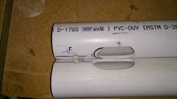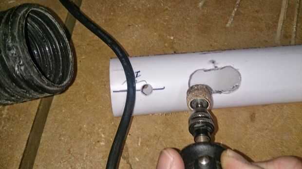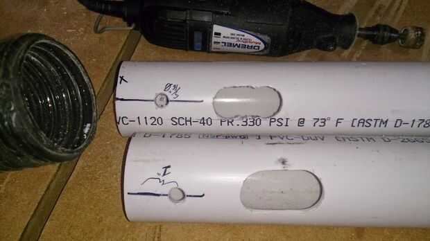 Después de perfeccionar el agujero en la primera pipa del PVC, espejo de ese agujero en el segundo tubo.
