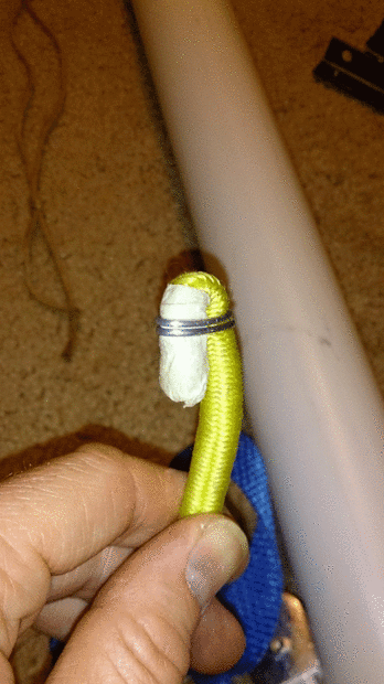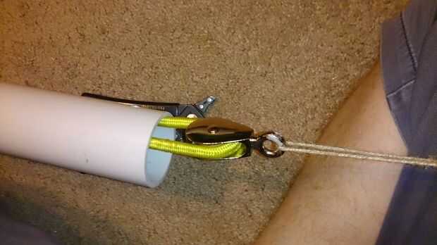 Debe colocar el gancho restantes sobre la parte delantera de la PVC. La parte delantera tiene el agujero oblongo para la polea.