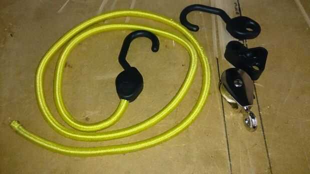 Las cuerdas del amortiguador auxiliar utilizadas en este ejemplo son resistentes. Deber de regular puede usarse para un lanzador menos poderoso. Estos cables tenían un gancho fijo y un gancho ajustable. Un amortiguador auxiliar con dos ganchos puede ser sustituido sin problemas.