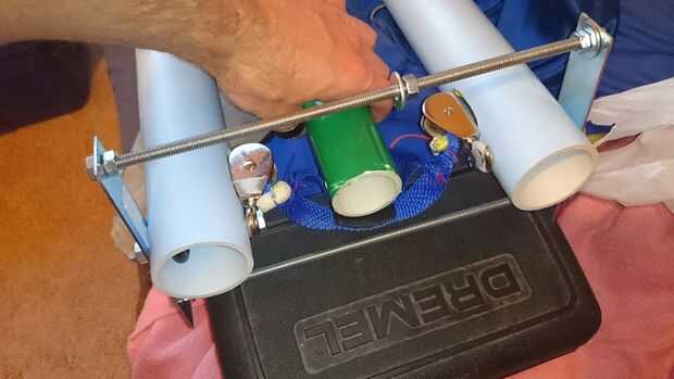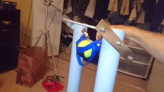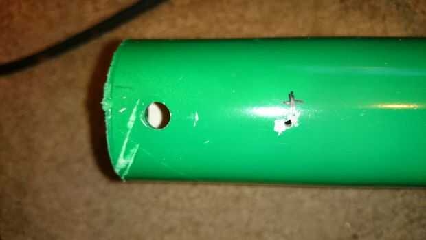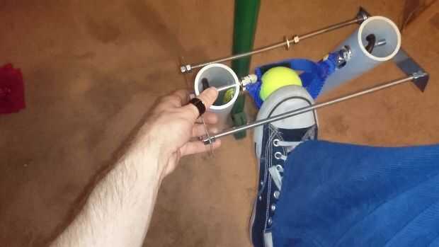 Como se mencionó anteriormente, el soporte frontal debe montarse en un ángulo por lo que un zapato puede caber entre la hamaca de la bola de tenis y el soporte. Esto se logra mediante (medir dos veces la primera vez * ejem *) taladrar un nuevo agujero en el tubo de PVC central que está más cercano el mecanismo del gatillo. Si el protector posterior no está instalado, hay poco punto en modificar el ángulo del soporte delantero.