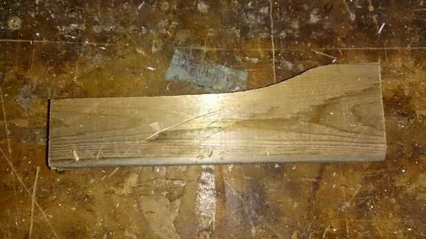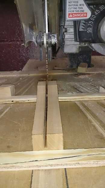 Una sierra de banda se utilizó para cortar la forma del mecanismo del gatillo que se muestra a continuación. Un segmento de ocho pulgadas de 2 x 4 es Ripeado (corte paralelo al grano del madera) lateralmente con un fin elevado. El extremo levantado finalmente se utilizará para contener la hamaca de la bola de tenis. Libera de manera similar a una ballesta. Esta forma también podría cortar con una sierra de marquetería.