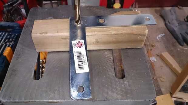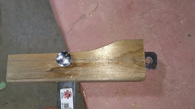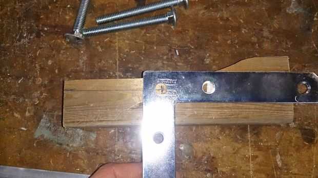 Una vez que estos agujeros se perforan el refuerzo de esquina debe ser capaz de sentarse libremente en el mecanismo de disparo y un perno debe ser capaz de pasar por los agujeros de 5/16". Cuando esto esté montado el soporte de ángulo debe ser capaz de moverse hacia adelante y hacia atrás.