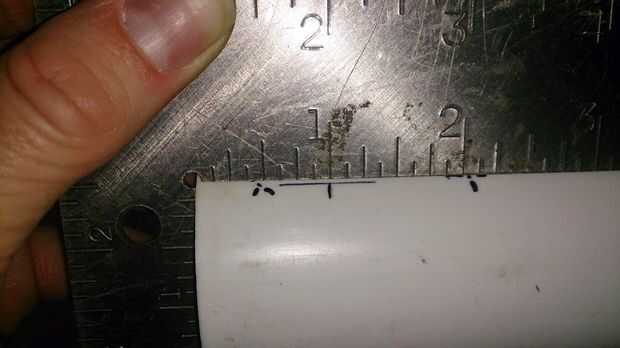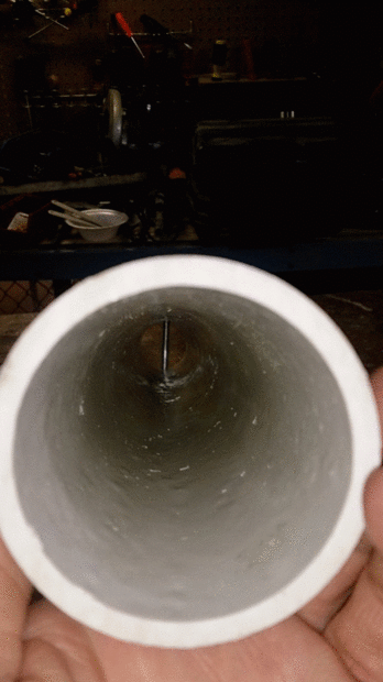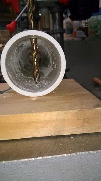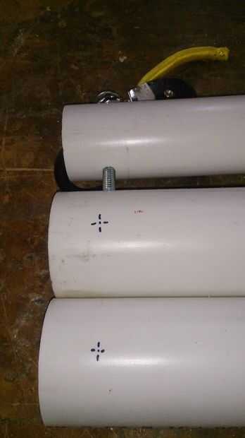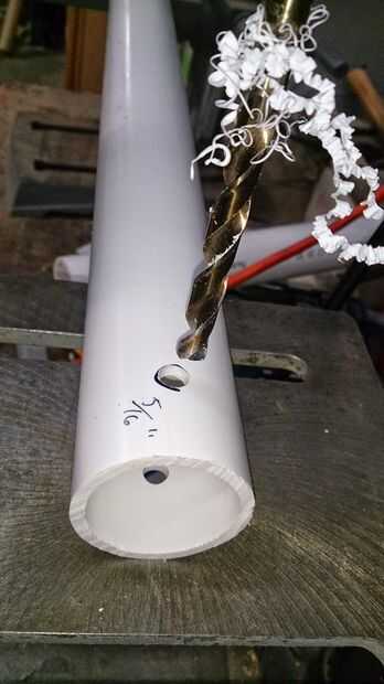 5/16 agujeros son perforados 1" de cada extremo. Los orificios funcionan paralelos a uno otro. Cada agujero pasa completamente a través del centro del PVC y por el otro lado. Pernos y varilla roscada deben ser capaces de pasar limpiamente a través de cada uno de los agujeros.