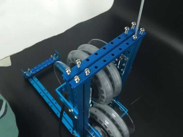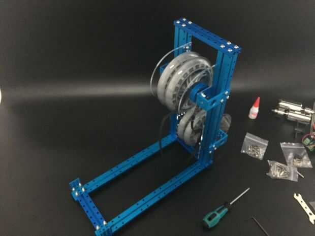 Se trata de un lanzador DIY construido con trajes Makeblock . Se utilizaron dos motores CNC para ruedas de fricción, de la cual la velocidad puede alcanzar 120km/h teóricamente. La máquina es lo suficientemente fuerte debido a su estructura metálica.