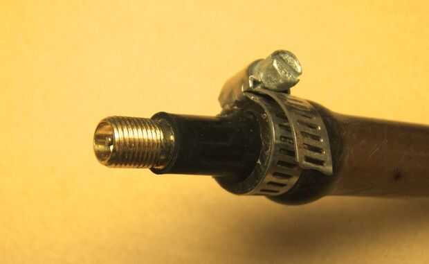 - Llevaba un guante de trabajo, empuje el extremo cortado de la manguera en el agua hirviendo de tal vez medio minuto ablandarlo y fuerza el grasa final de la válvula del neumático del coche en la manguera. Se debe ir en lo suficiente para tener cerca de 3/8 pulgada de manguera más allá de la parte grasa de la abrazadera (ver foto).